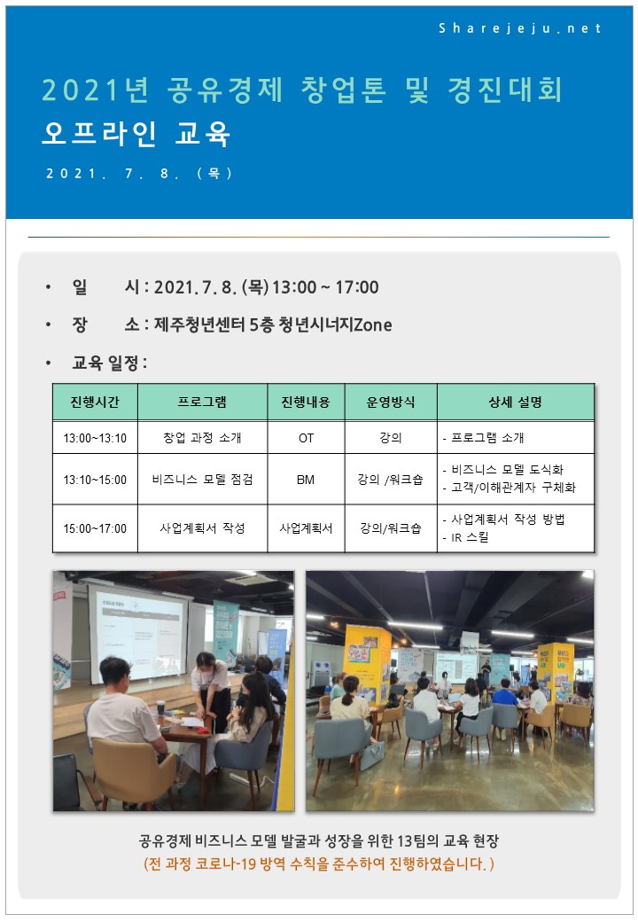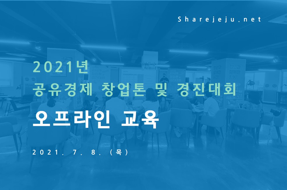 2021년 공유경제 창업톤 및 경진대회 오프라인 교육을 2021년 7월 8일 목요일 제주청년센터 5층 청년시너지Zone에서 진행하였습니다.